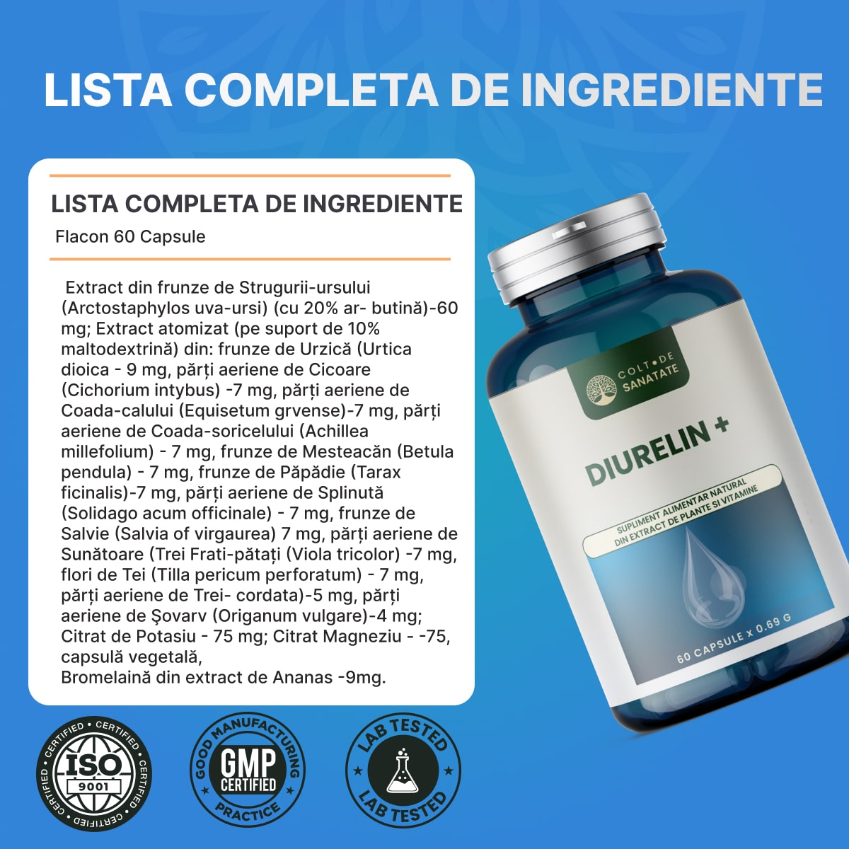 Diurelin: Diuretic Natural pentru Eliminarea Excesului de Apa, 15 Ingrediente, 60 Capsule