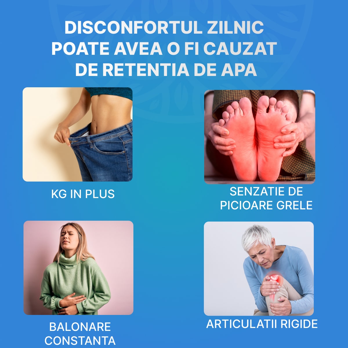 Retenția de apă poate duce la umflarea picioarelor, disconfort și senzație de greutate, mai ales în zilele călduroase sau după stat prelungit în picioare.