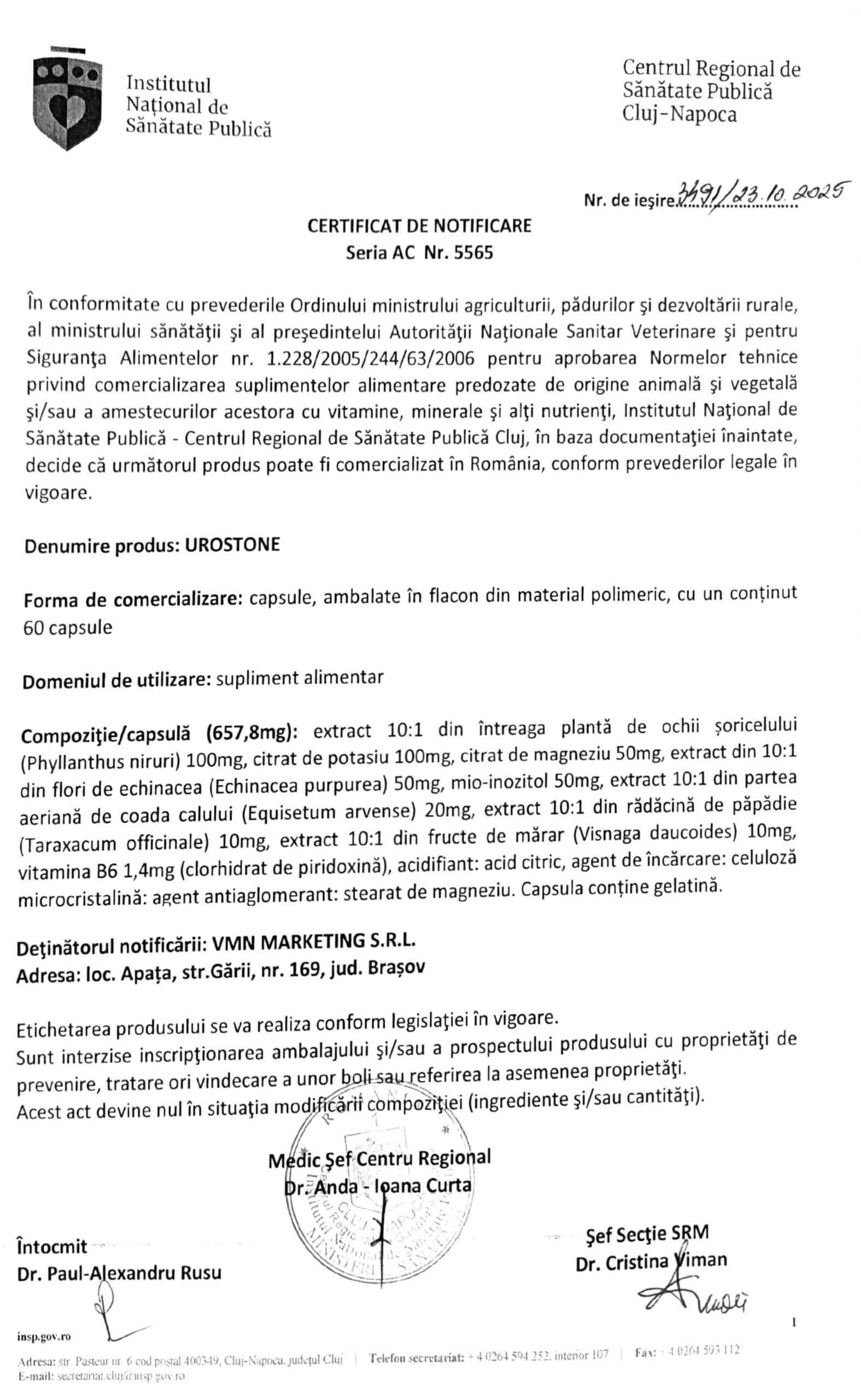 Descoperă UroStone®, supliment alimentar cu un complex 10 ingrediente din plante și vitamine, conceput pentru sănătatea rinichilor și a tractului urinar. Formula sa unică susține eliminarea naturală a pietrelor mici și a nisipului renal, ajută la reducerea disconfortului la urinare și contribuie la prevenirea formării calculilor. Cu UroStone, protejezi rinichii și sprijini funcția urinară în mod natural, zi de zi.