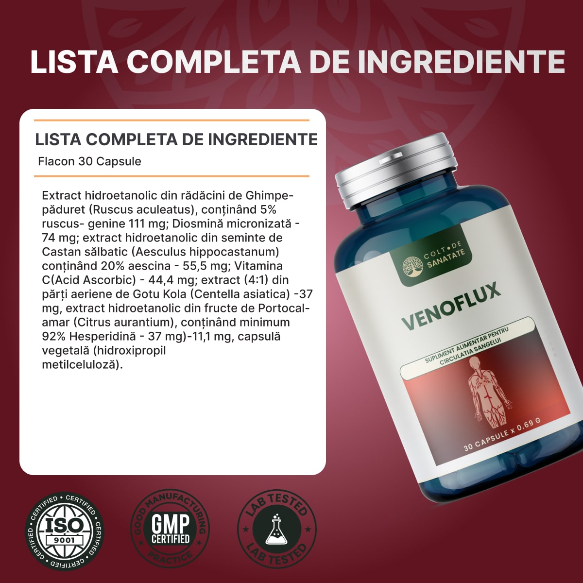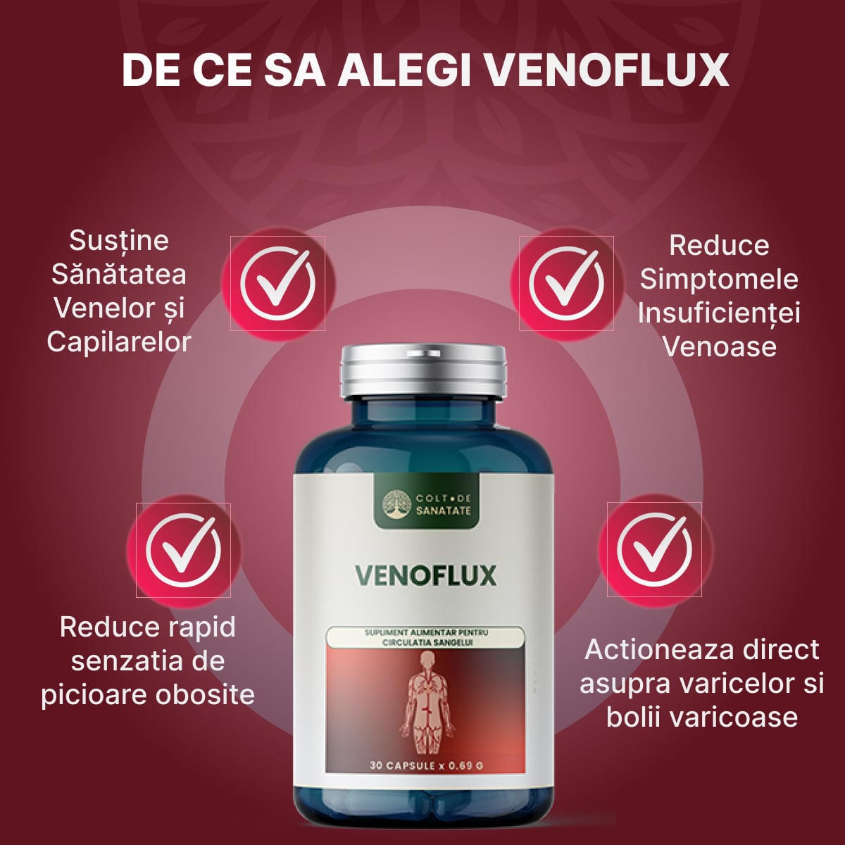 Descoperă VenoFlux – supliment natural formulat pentru întărirea pereților vasculari, stimularea circulației și combaterea simptomelor insuficienței venoase.